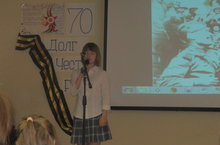 Учащиеся подготовили проекты о песнях военных лет, о жизни и творчестве М.В.Исаковского, хором спели "Катюшу", и в завершении ученица 8Б класса исполнила всем известную песню "На позиции девушка".