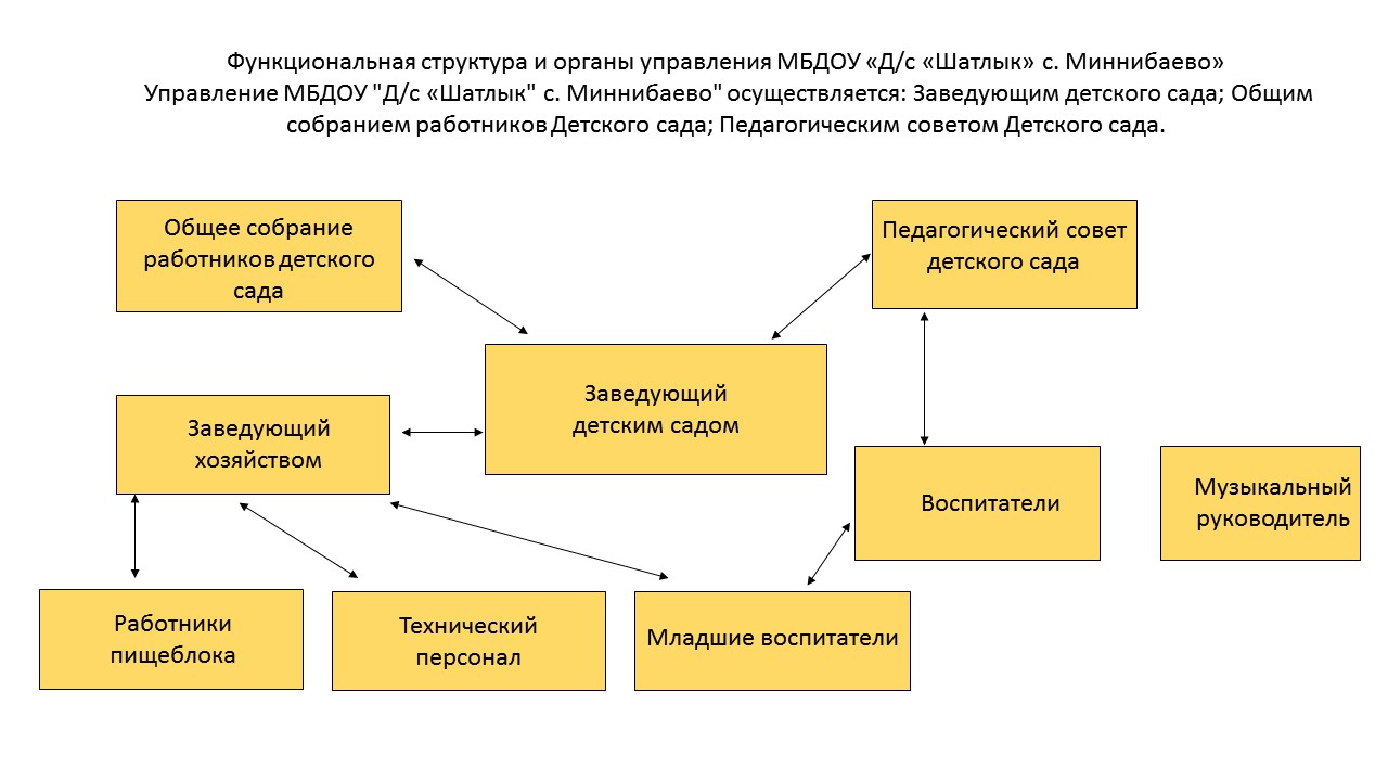 Управление МБДОУ "Д/с "Шатлык" с. Миннибаево" осуществляется в соответсвии с Уставом детского сада и. о. заведующим детского сада Сафиной Ляйсан Ильдаровной, действующей на основании приказа;
