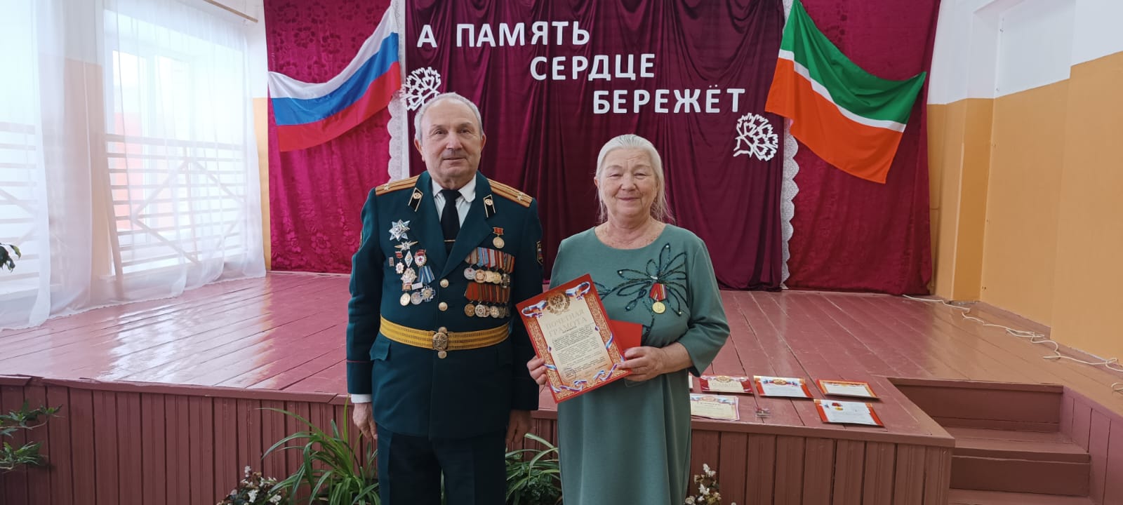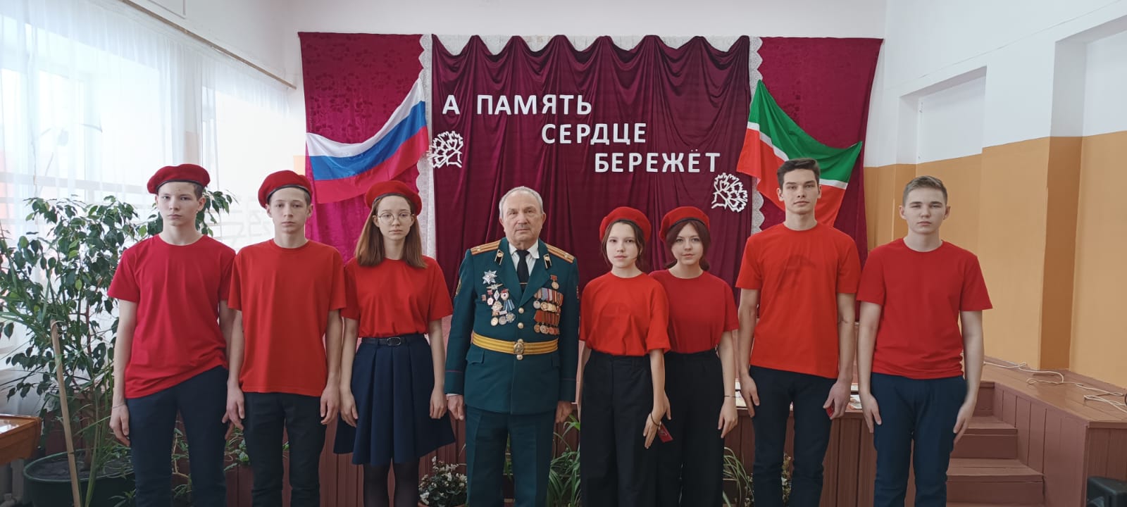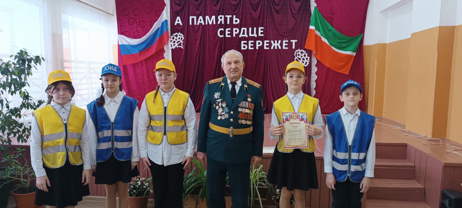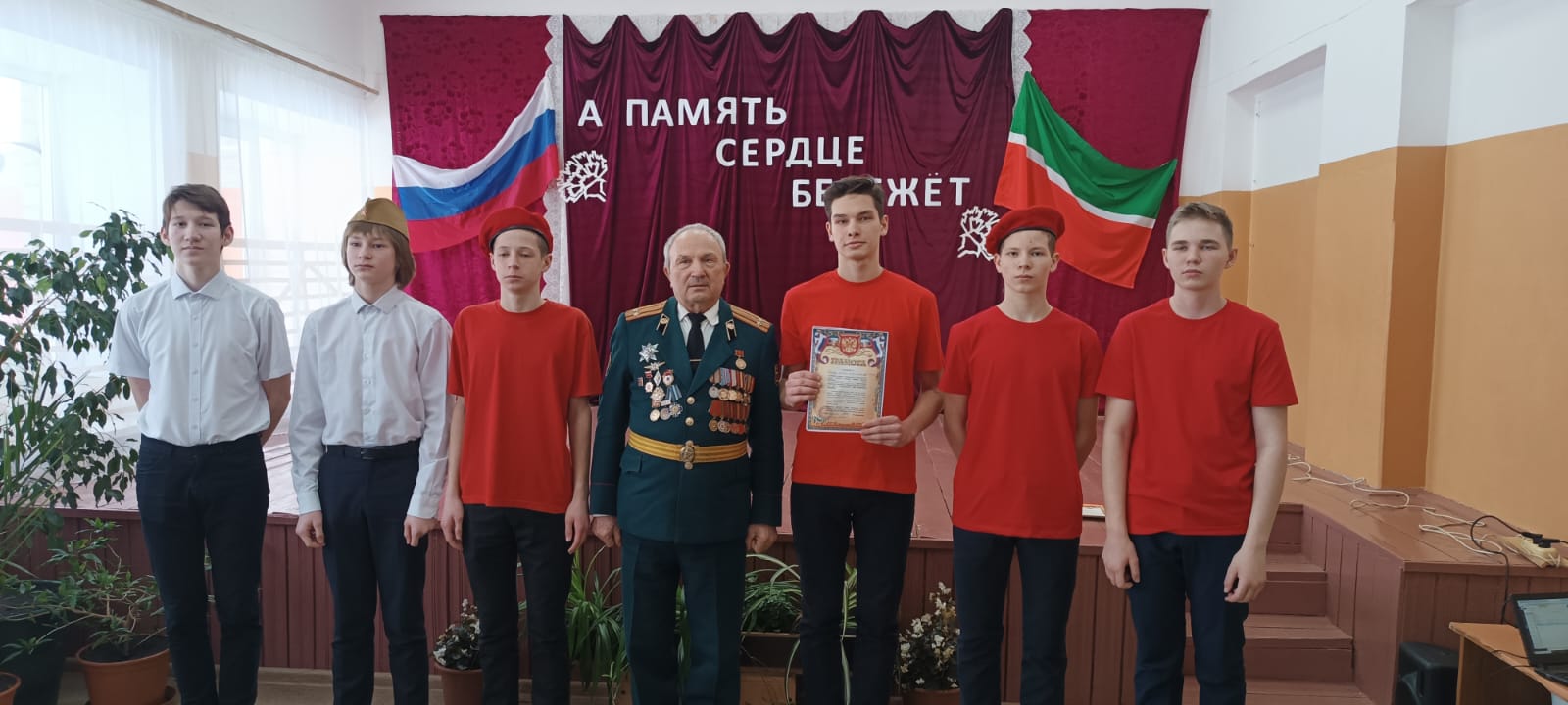 На фестиваль был приглашен подполковник в\о Димитриев Виталий Петрович - член российского союза ветеранов, директор филиала ветеранов войск РХБЗ РФ по Чувашской Республике, победитель первого конкурса по профессиональной обученности и полевой выучке офицерского состава вооруженных сил СССР в химических войсках среди командиров батальонов и начальников химических служб частей и соединений войск, кандидат в мастера спорта СССР по легкой атлетике, борьбе, военному троеборью, ветеран военной службы, труда. В рамках месячника патриотизма с учащимися школы был проведен урок мужества. Представителями чувашского регионального отделения, директором филиала войск РХБЗ России по Чувашской Республике за большой вклад в патриотическое воспитание подрастающего поколеия награждены Решением Российского комитета ветеранов памятным знаком (медалью) "65 лет Российскому союзу ветеранов":