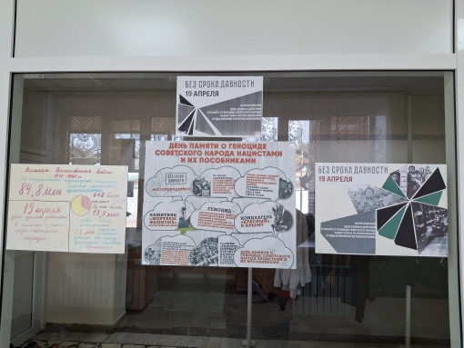 Опубликовано: 19.04.2025День памяти жертв геноцида Советского народа – это не просто дата в календаре, это напоминание о страшных страницах нашей истории, о тех неисчислимых жертвах и страданиях, которые выпали на долю наших предков в годы Великой Отечественной войны. В нашей школе этот день была организованна выставка, призванная почтить память погибших и донести до современных школьников правду о тех трагических событиях.
