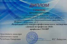 20 апреля 2018 года Плеханов Денис, учащийся 9 Б класса, под руководством учителя профильного труда Абдуллина А.Г. одержал победу в республиканском конкурсе "Лучший по профессии. Конкурс организован МО и Н РТ для обучающихся с ограниченными возможностями здоровья. Поздравляем с победой!