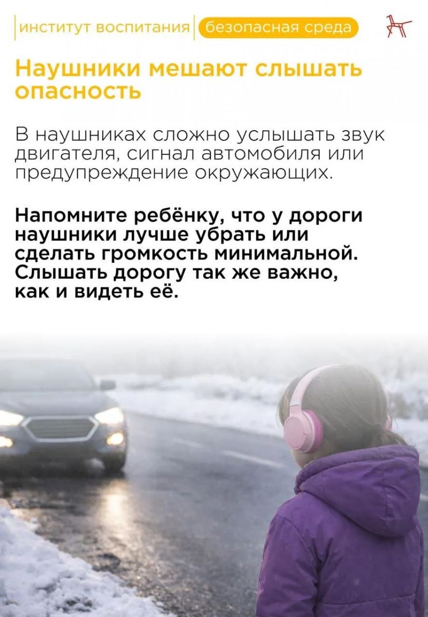 Опубликовано: 05.02.2026???? Зимой дети часто выходят на улицу в капюшоне и с наушниками. Так теплее и привычнее, но при переходе проезжей части это может быть опасно. Ребёнок хуже слышит, что происходит вокруг, и не всегда видит приближающийся автомобиль. Важно объяснить, почему такие мелочи действительно имеют значение. Ценные рекомендации Института воспитания — смотрите в карточках. #ФЦП_безопасность