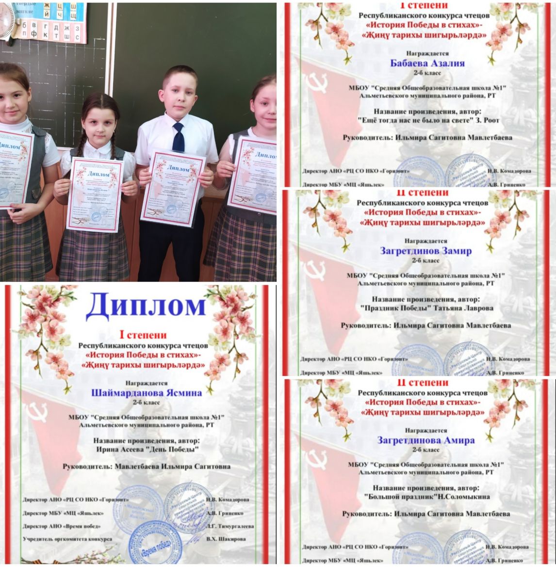 Обучающиеся 2-б класса участвовали в Республикансом конкурсе чтецов" История Победы в стихах"-'Җиңү тарихы шигырьләрдә". Бабаева Азалия Диплом I cтепени Шаймарданова Ясмина Диплом Iстепени Загретдинова Амира Диплом II степени Загретдинов Замир Диплом II степени Поздравляем ребят с победой!Творческих успехов!