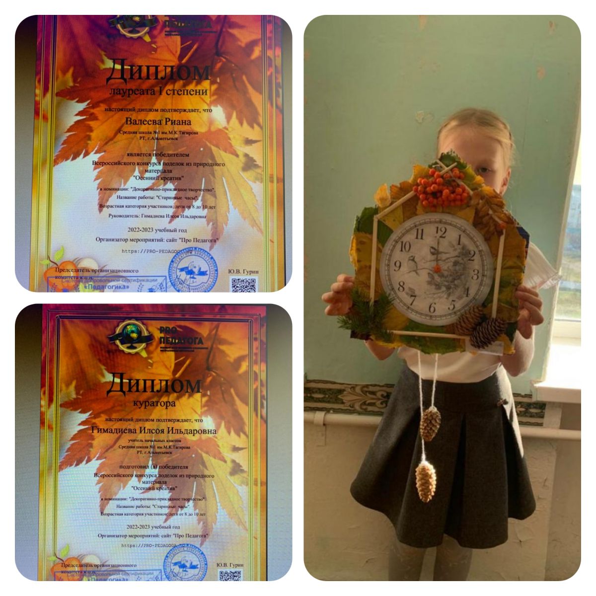 Ученица 3а класса Валеева Риана стала Лауреатом Всероссийского конкурса поделок из природного материала «Осенний креатив», в номинации «Декоративно-прикладное творчество», под руководством Гимадиевой Илсои Ильдаровны. Поздравляем с победой! Желаем здоровья и творческих успехов!