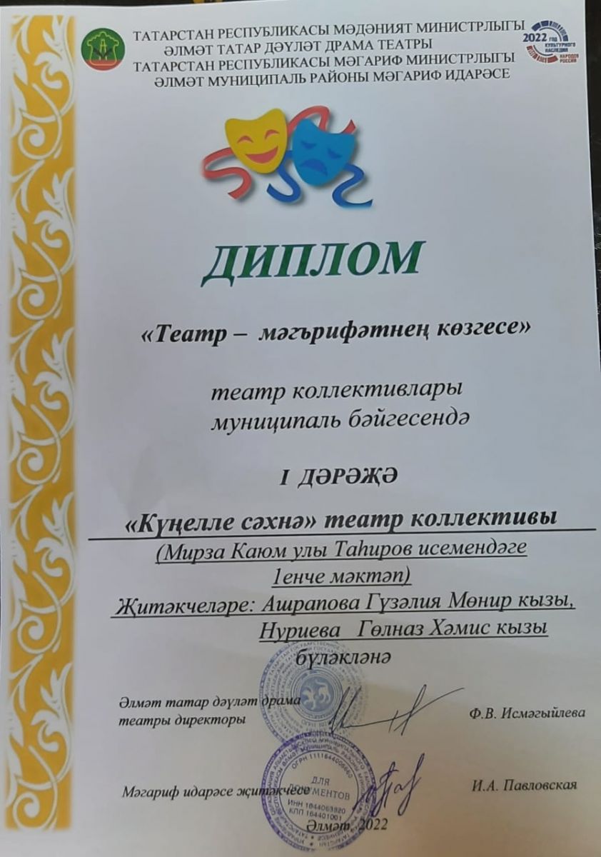 17 май көнне Әлмәт шәһәре драма театрында "Театр - мәгърифәтнең көзгесе" театр коллективлары муниципаль бәйгесенең финал туры узды. Әлеге мәртәбәле бәйгедә мәктәбебезнең "Күңелле сәхнә " коллективы да катнашып җиңү яулады: 1 дәрәҗә диплом белән бүләкләнде. Чара искиткеч матур итеп, күңел җылысын биреп оештырылган иде. Укучыларыбыз үзләрен дә күрсәтеп, башка коллективларның чыгышларын да карап, рухи азык туплап кайттылар. Киләчәктә дә зур уңышларга ирешергә язсын иде "Күңелле сәхнә" йолдызларыбызга.