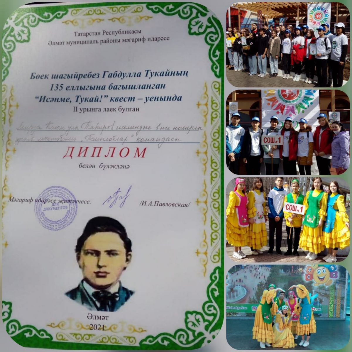 23 апрельдә шәһәребезнең ял паркында “Сәлам, Тукай!” дигән квест-уены узды. Анда мәктәбебезнең 9 А сыйныфы укучыларыннан торган “Полиглотлар” командасы да катнашты. Укучылар биредә татар әдәбияты, сәнгате буенча белемнәрен тикшерделәр, тапкырлыкта, зирәклектә көч сынаштылар. Бөек шагыйребез Габдулла Тукайның һәркайсыбызга сабый чактан ук таныш “Бала белән күбәләк” җырына укучыларыбыз тарафыннан иҗат ителгән клип, Парк зоопаркына реклама “Полиглотар”ның иҗади осталыгын тагын бер кабат дәлилләде. Галиев Ильяс укыган “Кайсыгызның кулы җылы?” (Х.Туфан) әсәре дә күңелләрне тетрәндерерлек булды.