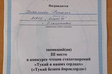 26 апреля вся страна чествует великого татарского поэта Г.Тукая: проводят конкурсы, литературные вечера, ставят театральные постановки. Недавно прошел муниципальный конкурс чтецов «Посвящается Великому человеку…», где наша ученица 6г класса Хисамиева Риналия заняла I место, после чего отправилась в г. Казань, где Казанский национальный исследовательский технологический университет проводил республиканский конкурс чтецов «Тукай в наших сердцах». Наша Риналия заняла почетное III место. Поздравляем тебя, Риналия, с победой и желаем дальнейших успехов!