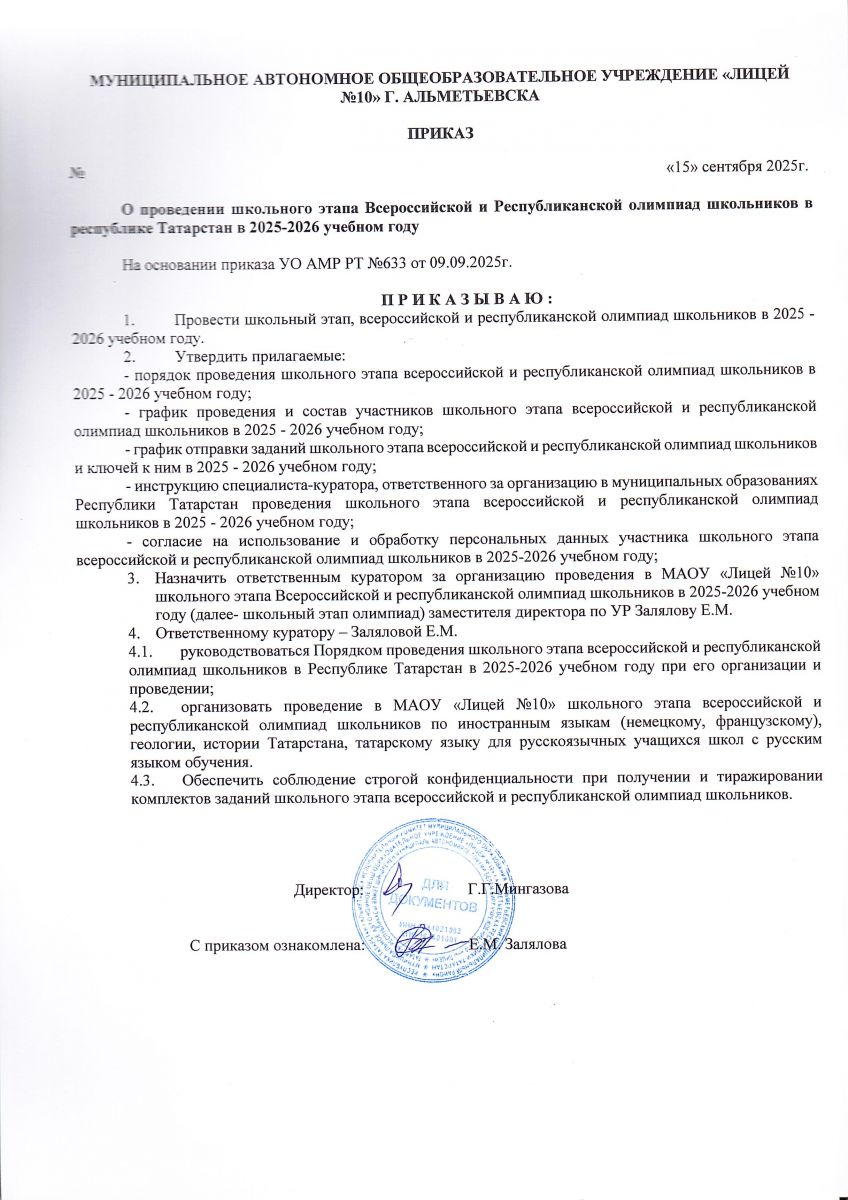 Приказ по МАОУ "Лицей №10" о проведении школьного тура олимпиады на 2025-2026 учебный год;