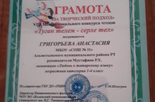 Әлмәт шәһәре муниципаль белем бирү учреждениесе «11нче гомуми урта белем бирү мәктәбе»нең 2 а сыйныфы укучысы Григорьева Анастасия регионнар арасында үткәрелгән «Туган телем-серле тел» конкурсында җиңүче булды. Укытучысы - Мустафина Р.Х.
