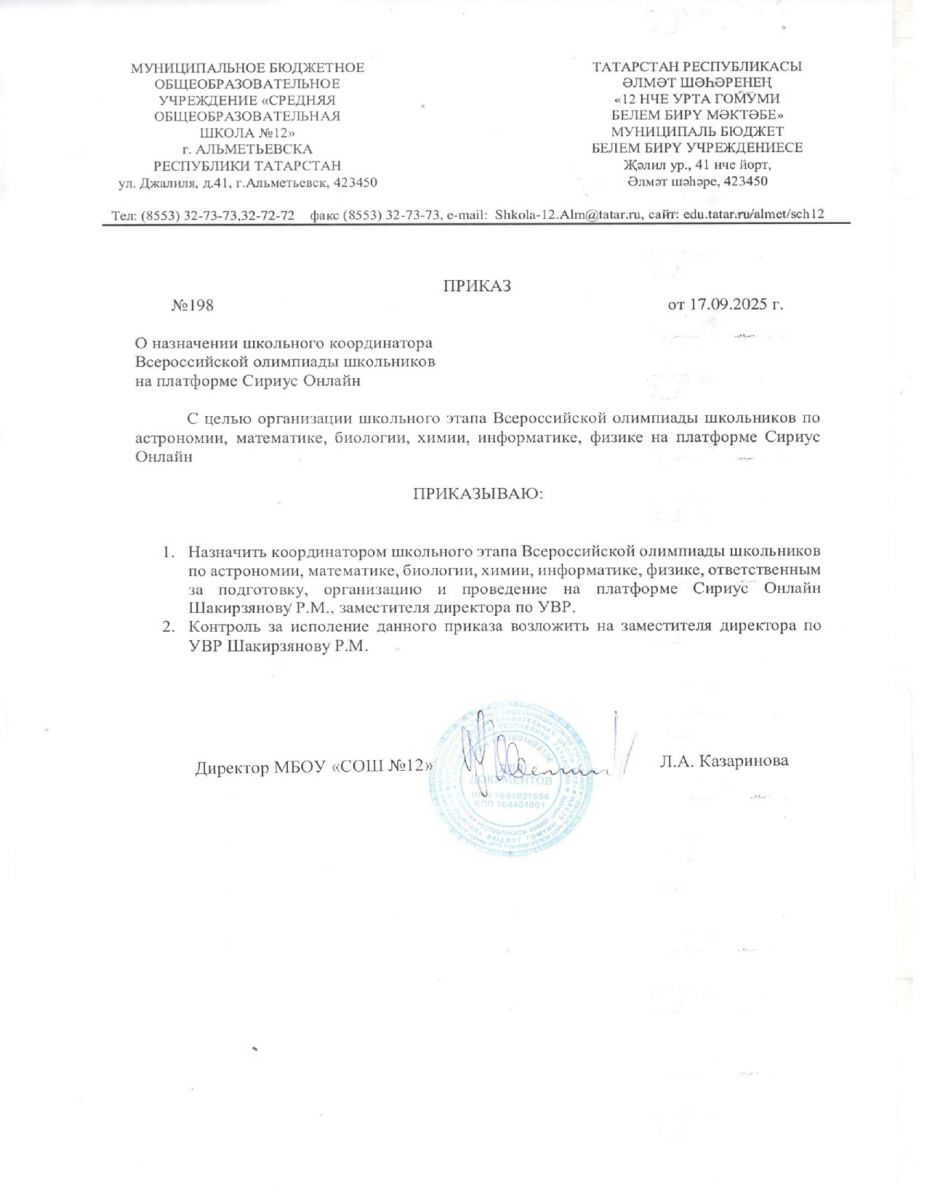 Приказ о назначении школьного координатора ВОШ на платформе Сириус Онлайн