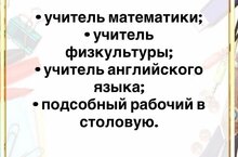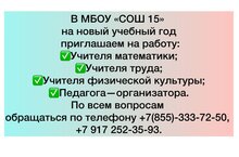 В МБОУ "СОШ 15" ТРЕБУЮТСЯ : учитель математики ; - учитель физкультуры ; учитель английского языка; - подсобный рабочий в столовую. Обращаться по телефону: +7-917-252-35-93 22.08.2025