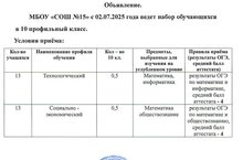 Объявление. МБОУ « СОШ Nº15» с 02.07.2025 года ведет набор обучающихся в 10 профильный класс 26.06.2025