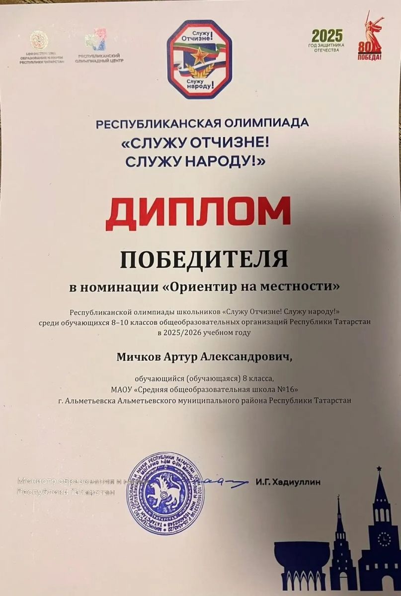 С 10 по 17 ноября в г. Казани прошла республиканская олимпиада школьников «Служу Отчизне! Служу народу!» среди обучающихся 8-10 классов общеобразовательных организаций Республики Татарстан. Ученик 8А класса нашей школы Мичков Артур стал призером олимпиады и победителем в номинации «Ориентир на местности» .