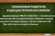 Администрация МБОУ «СОШ №2» г. Альметьевска приглашает Вас на родительское собрание, которое состоится 25 марта (среда) в 18.00 в кабинете 12б. При себе иметь паспорт и бахилы.
