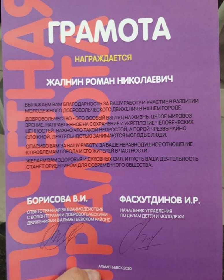 6 декабря 2020 года, в рамках мероприятий, посвящённых Дню добровольца - 2020, учащийся нашей школы, член военно - патриотического общества "Феникс" Жалнин Роман был награждён Почетной грамотой.