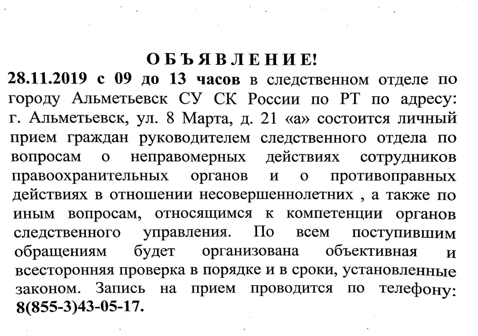 Прием граждан руководителем следственного одела по вопросам о неправомерных дйствиях сотрудников правоохранительных органов и о противоправных действиях в отношении несовершеннолетних.