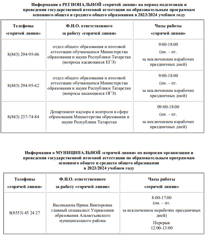 Информация о работе телефонов «горячей линии» по вопросам организации и проведения государственной итоговой аттестации по образовательным программам основного общего и среднего общего образования в 2023-2024 учебном году
