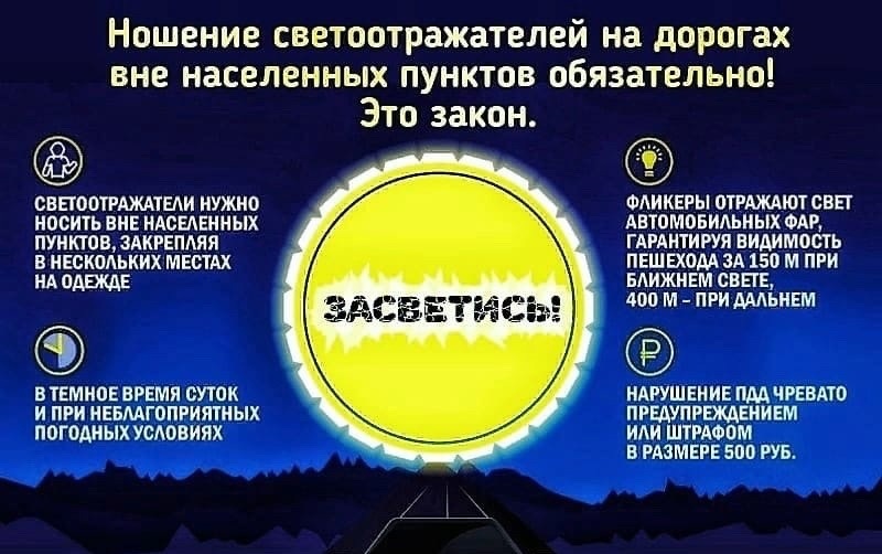Приближается время года, когда на улице темнеет чуть раньше и видимость на дорогах может снижаться из-за дождя и снега. Поэтому очень важно сделать ребёнка более заметным на слабоосвещённых улицах и в тёмное время суток. Сделать ребёнка заметным помогут световозвращающие элементы. По статистике наезд на пешехода — один из самых распространенных видов ДТП, а использование световозвращателей снижает риск наезда на пешехода на 65—80 %. Помните, что световозвращатели эффективны при условии соблюдения правил дорожного движения!