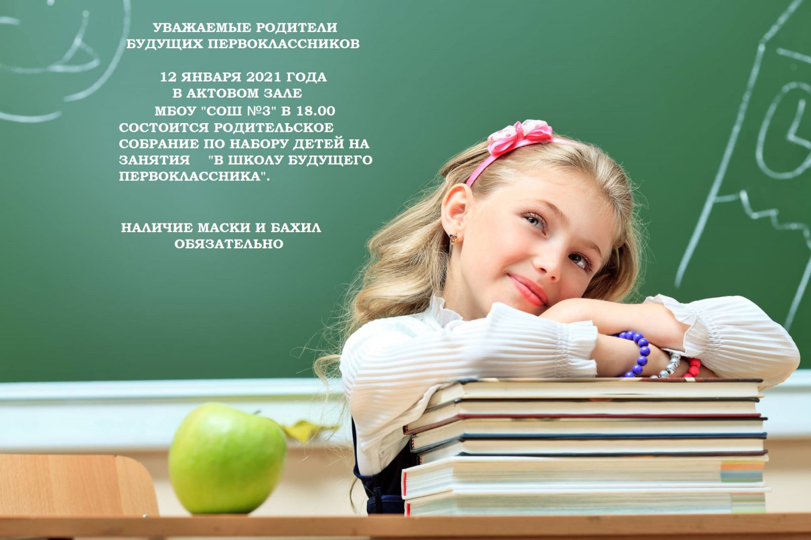 Уважаемые родители будущих первоклассников.12 января 2021 годв в актовом зале МБОУ "СОШ №3" в 18.00 состоится родительское собрание по набору детей на занятия "В школу будущего первоклассника". Наличие маски и бахил обязательно.