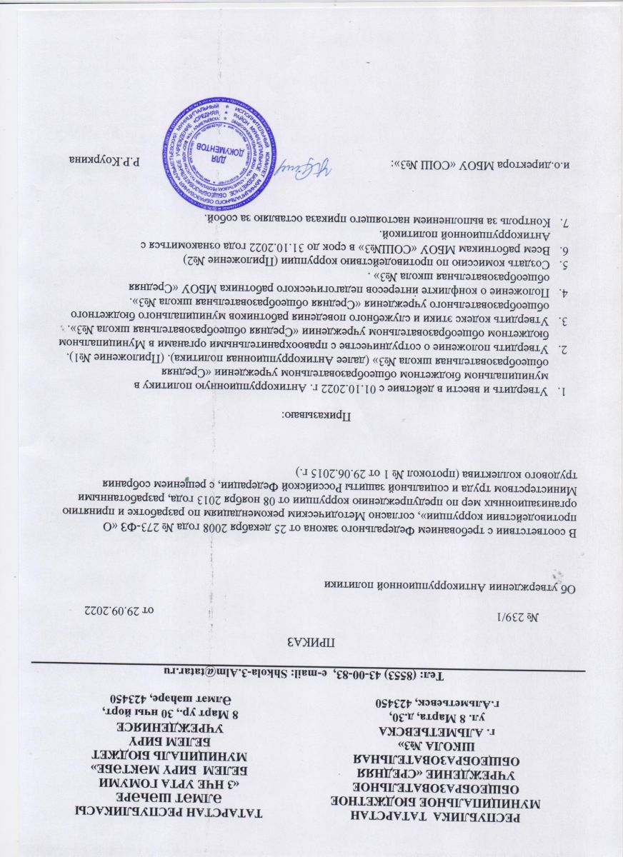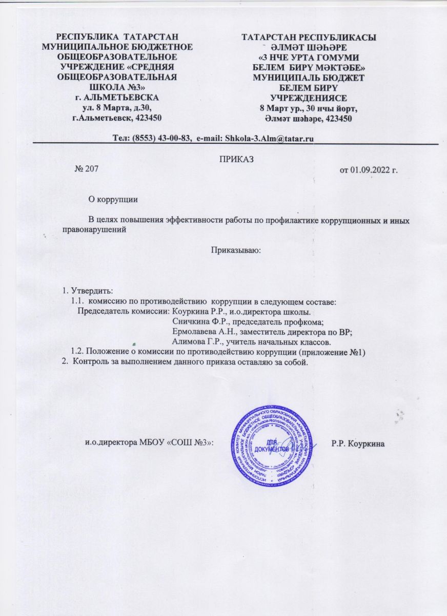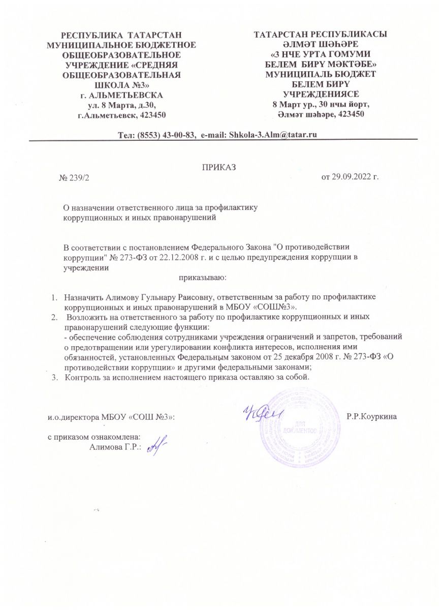 - Приказ о назначении отвественного лица за профилактику коррупционных и иных правонарушений