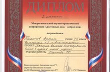 В МАОУ «Средняя общеобразовательная школа №16» Альметьевского муниципального района РТ прошла Межрегиональная научно-практическая конференция «Достойные дела доброе имя». Ученик 4-б класса гимназии №5 Тихонов Артём под руководством Хасановой Р.Р. выступил с проектом «История Великой Отечественной войны в судьбах моих родных». По итогам конференции Артём был награждён Дипломом I степени. Поздравляем! Желаем дальнейших побед!