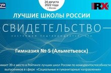 МАОУ "Гимназия №5" вошла в число лучших школ России согласно исследованию, проведённому в 2022 году рейтинговым агентством RAEX