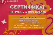 18 сентября 2022 года состоялось награждение участников конкурса шумовых точек поддержки Альметьевского полумарафона. Команде МАОУ «Гимназия №5» вручен сертификат за активное участие.