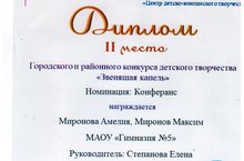 27 апреля в Центре детского и юношеского творчества состоялся Гала-концерт Городского и районного конкурса «Звенящая капель». В этот день на сцене выступали и награждались лучшие участники конкурса. МАОУ «Гимназия №5» представляли обучающиеся в номинациях «Хореография», «Вокал-соло», «Конферанс». Призовые места распределились следующим образом: Лебедев Тимур занял 1 место в номинации «Конферанс», Мироновы Амелия и Максим стали обладателями 2 места в этой же номинации. Солистки вокальной студии «Зодиак» стали обладателями 1 места - Фазлыева Дина и 2 места - Салахутдинова Диляра в номинации «Вокал-соло». Театр танца «Сэлэт» стал обладателем 3 места в номинации «Хореография».