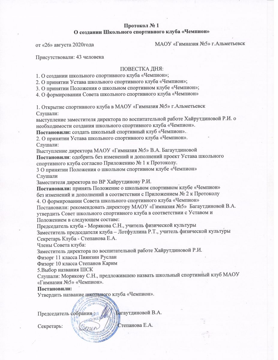 Проток №1 от 26.08.2020 г. "О создании Школьного спортивного клуба "Чемпион"