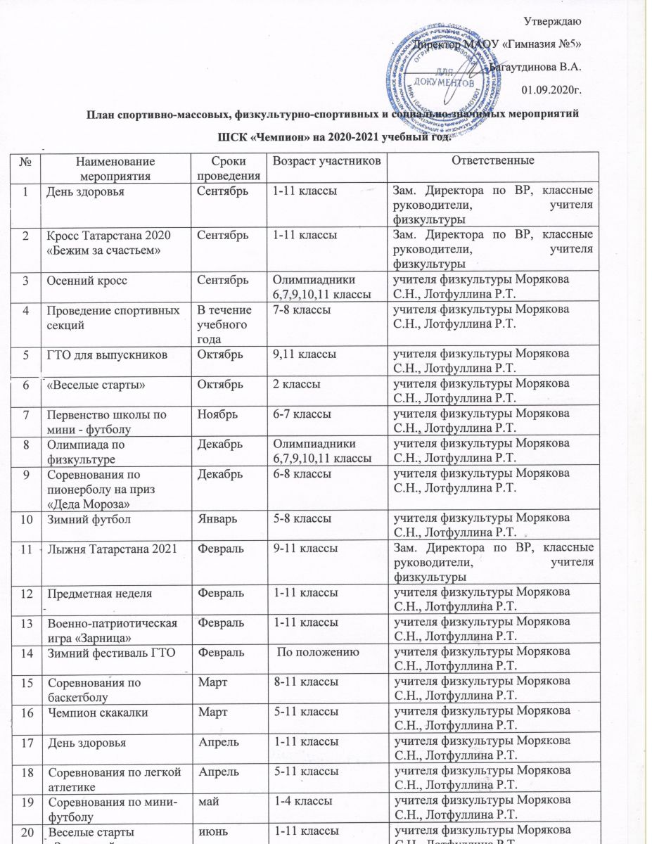 Календарный план спортивно-массовых мероприятий школьного спортивного клуба «Чемпион»