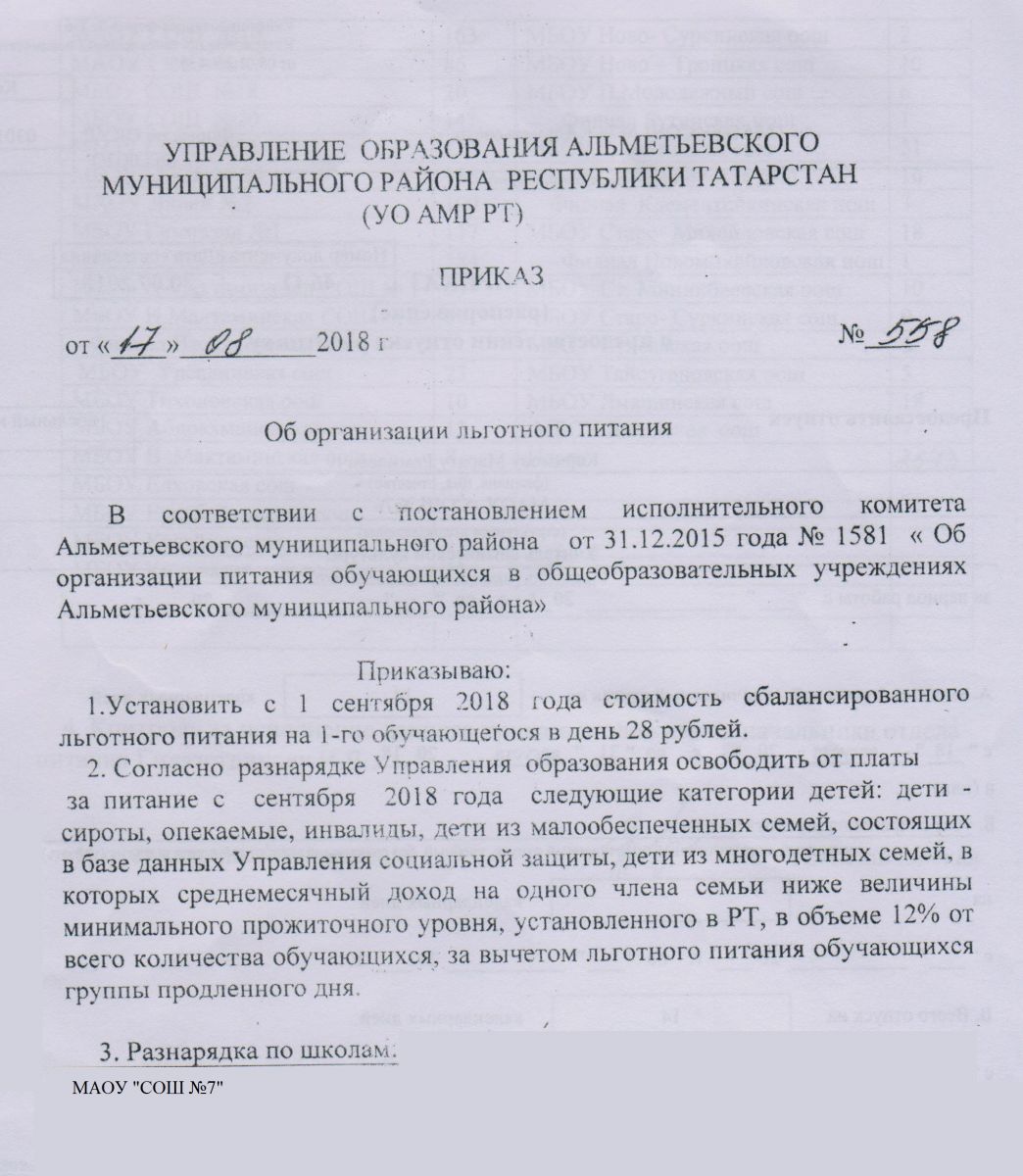 Приказ об освобождении от платы за питание учащихся, находящихся в группах продленного дня
