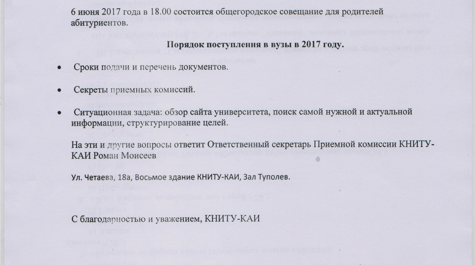 Опубликовано: 22.05.20176 июня 2017 года в 18.00 состоится общегородское совещание для родителей абитуриентов.