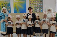 Беренче сыйныф укучыларынын чыгышлары. Алар Кыш бабайга "Куяннар бию"ен әзерләгәннәр.