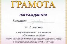 Команда нашей школы "Сулеевец" награждена Грамотой и медалью за 1 место в соревнованиях по хоккею "Золотая шайба" среди сельских команд по месту жительства в возрастной группе 1996-1997 г.р.
