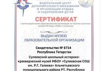 Школьному музею выдан сертификат о регистрации музея образовательной организации на Портале школьных музеев РФ.