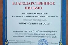 Наша школа была награждена Благодарственным письмом Управления образования Альметьевского муниципального района РТ за активное участие в Республиканской ярмарке сельскохозяйственной продукции и изделий технического творчества "Город мастеров-2025". Поздравляем!!