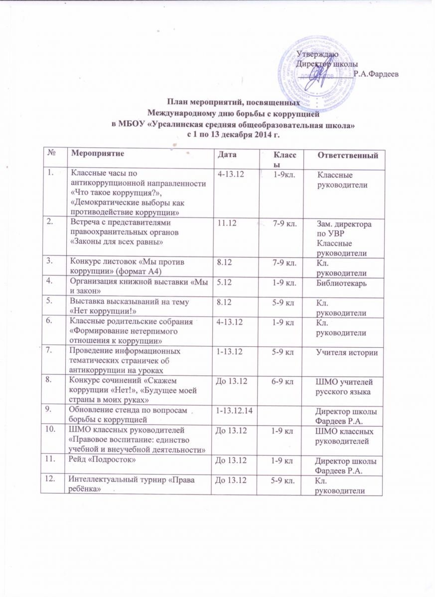 План мероприятий, посвященных Международному дню борьбы с коррупцией