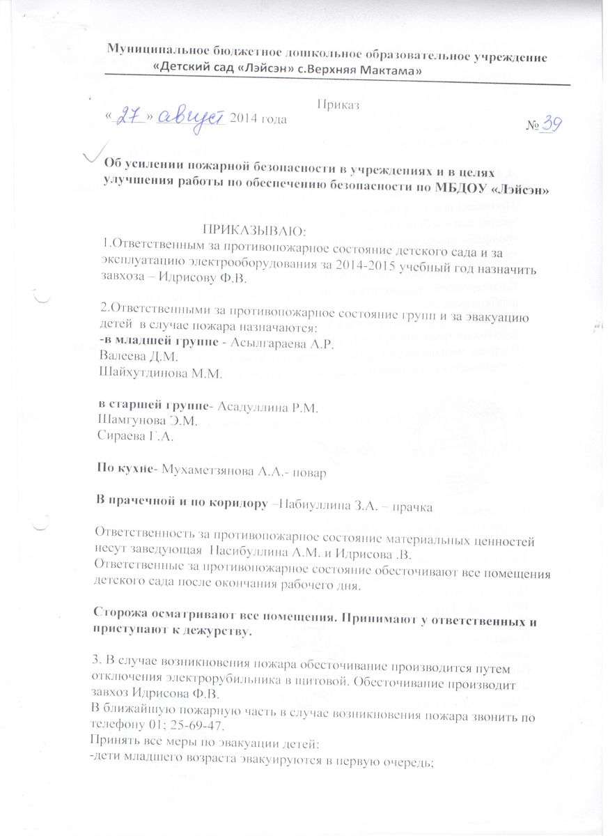Приказ об усилении пожарной безопасности в учреждениях и в целях улучшения работы по обеспечению безопасности