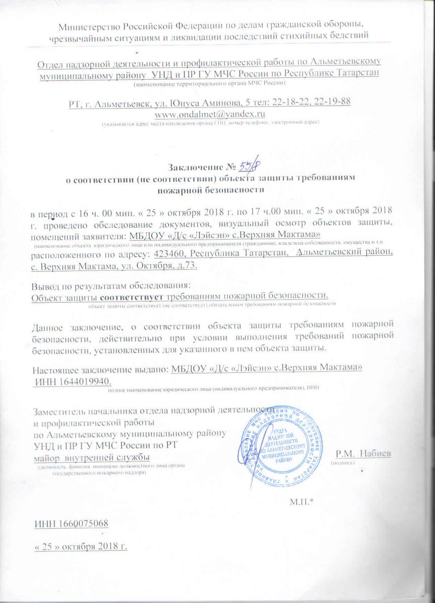Заключение ПОЖНАДЗОРА от25.10.2018г.