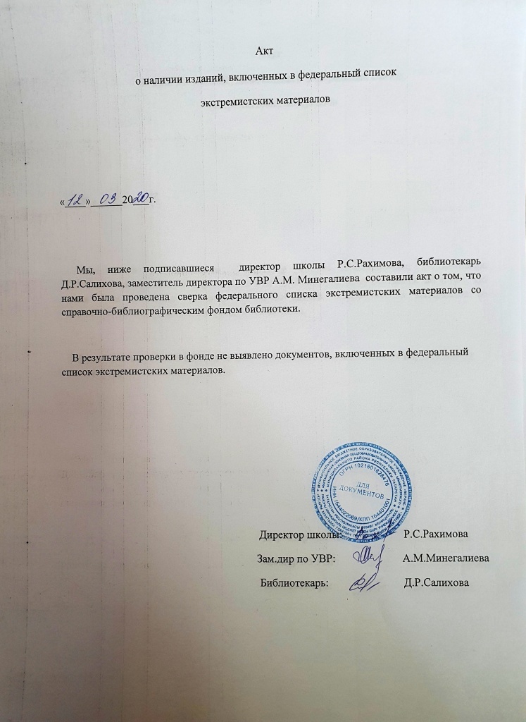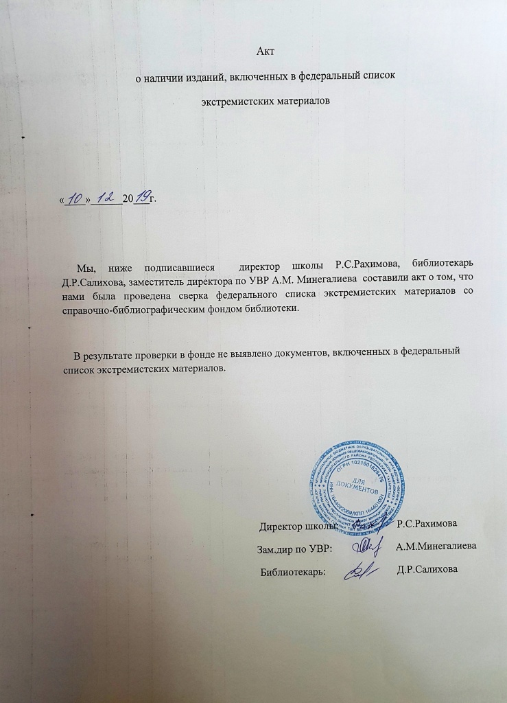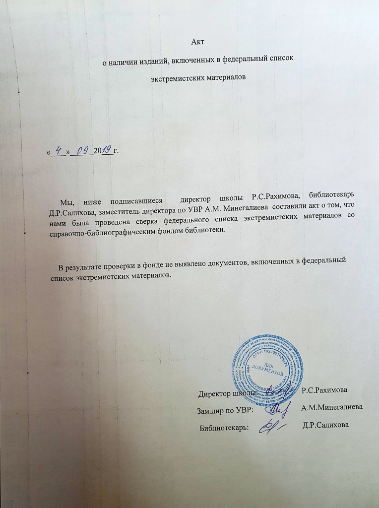 Акты проверки наличия (отсутствия) экстремистской литературы в школе (сентябрь) (декабрь) (март)