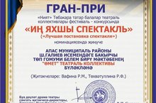 "Ният" төбәкара татар балалар театраль коллективлары фестиваль- конкурсында мәктәбебезнең "Өмет" театраль коллективы (җит. Вафина Р.М., Төхвәтуллина Р.ф.) "ИҢ ЯХШЫ СПЕКТАКЛЬ" номинациясендә җиңү яулады. Котлыйбыз!!! Алга таба да зур уңышларга ирешергә насыйп булсын. Афәрин!/