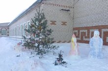 Учащиеся и учителя школы украсили территорию школы снежными фигурками из Деда Мороза, Снегурочки, черепахи, змеи и хозяина 2017 года - Петуха.