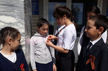 Волонтёры школы принимают активное участие в Республиканском проекте "Шаги Победы Татарстана". Сегодня ребята провели акцию "Георгиевская ленточка".