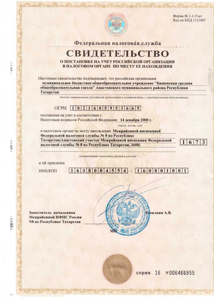 Свидетельство о постановке на учет в налоговом органе