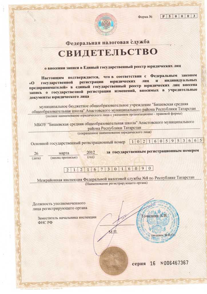 Свидетельство о внесении записи в ЕГРЮЛ