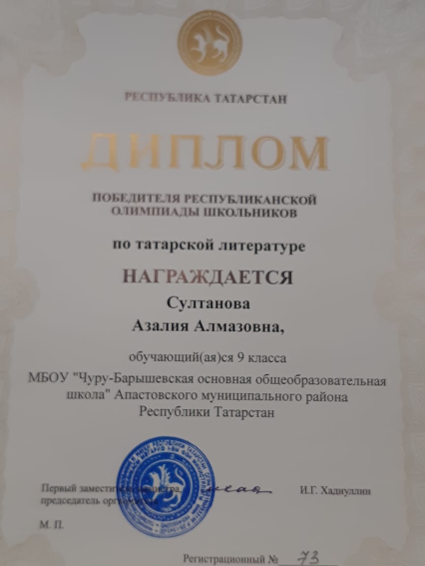 Султанова Азалия - победитель Республиканской олимпиады школьников по татарской литературе. Руководитель - Нургалиева Л.И., учитель родного (татарского ) языка и литературы. Молодцы!Татар эдэбияты буенча Республика олимпиадасында Султанова А. А. җиңүче булды, котлыйбыз! Җитәкчесе- татар теле һәм әдәбияты укытучысы Нургалиева Л.И. -