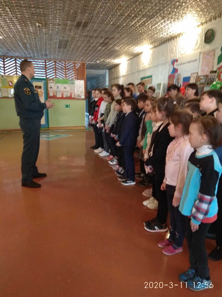 11.03.2020 года начальник МОНД и ПР по Апастовскому и Кайбицкому муниципальных районов УНД и ПР ГУ МЧС РФ по РТ Валиев И.И. провел беседу с учащимися на тему «Пожарная безопасность». Также им был проведен инструктаж на тему «Весеннее половодье. Безопасные весенние каникулы». -