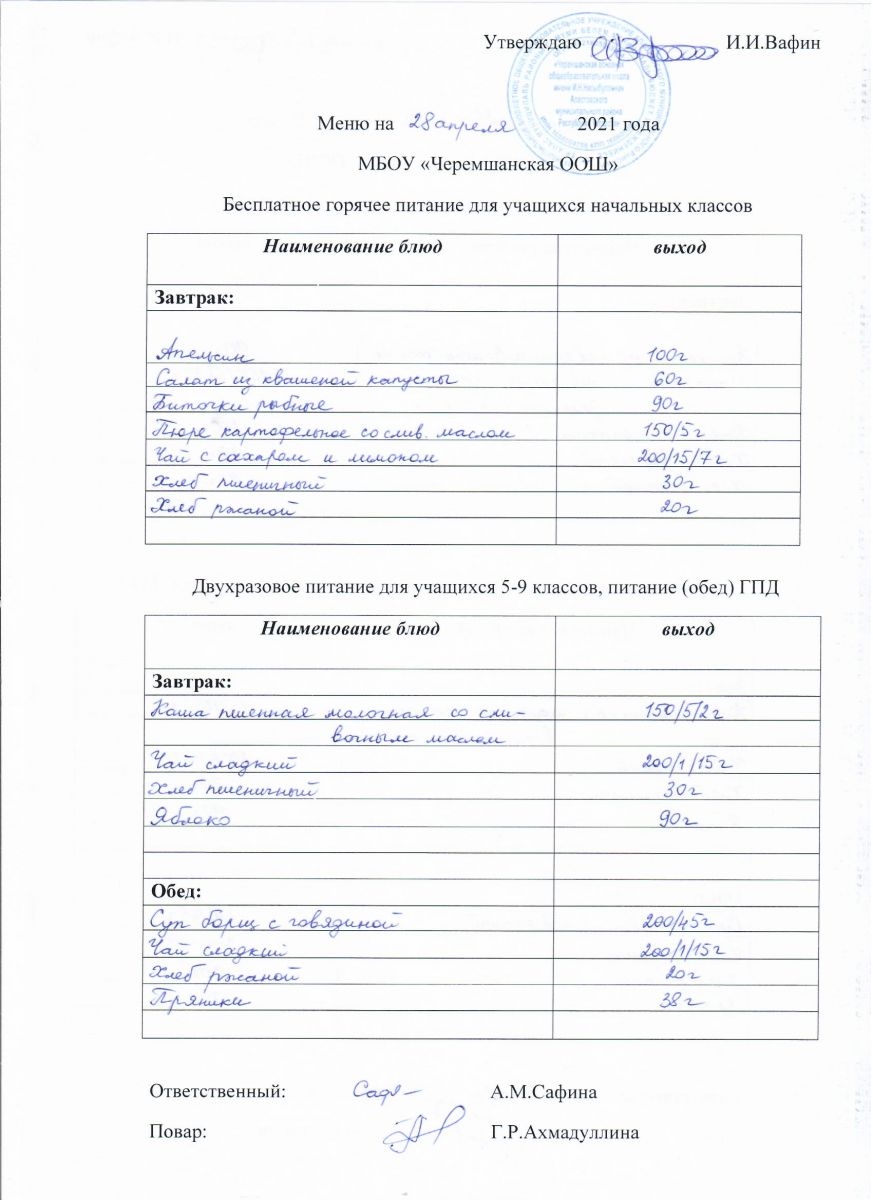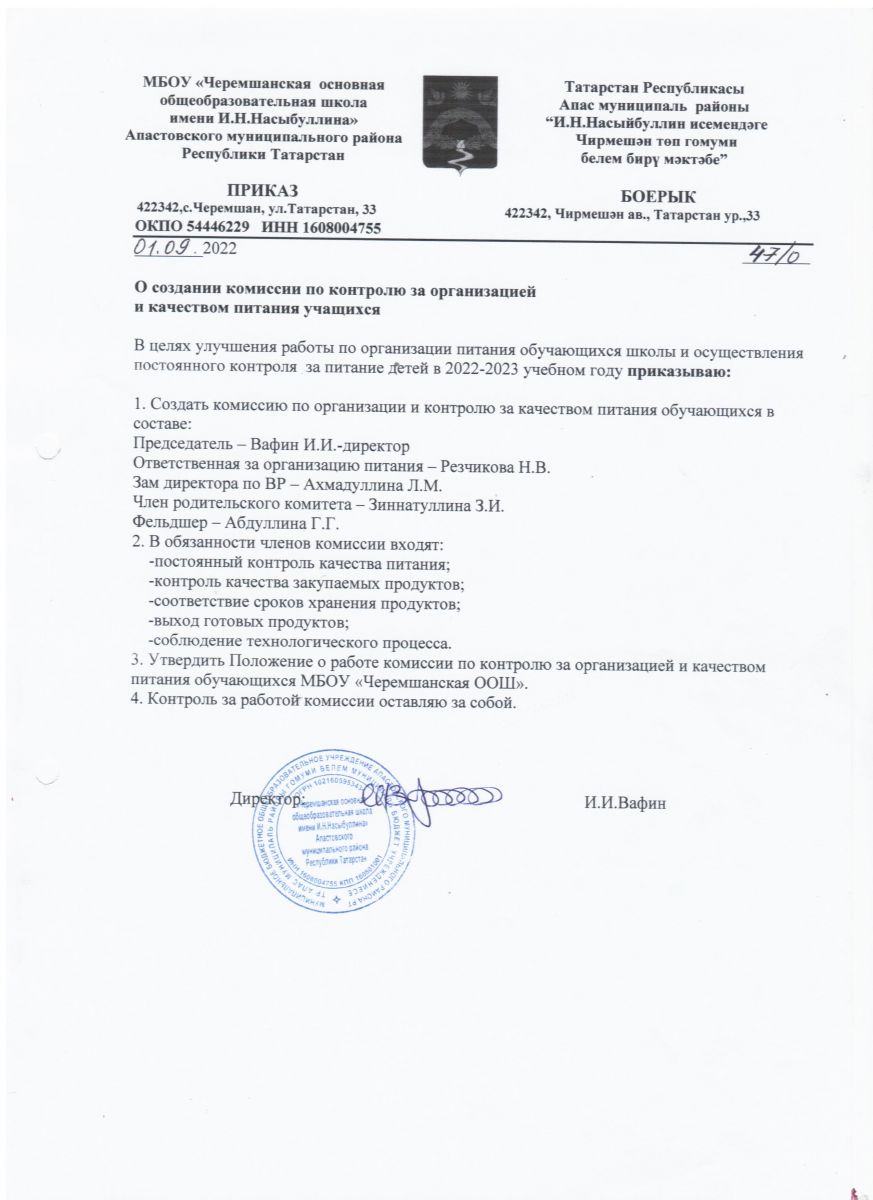 Приказ об организации питания в МБОУ «Черемшанская ООШ»