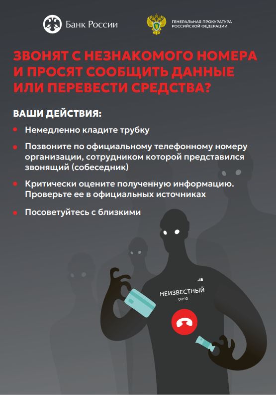 Ввиду возрастания угроз преступных посягательств Генеральной прокуратурой Российской Федерации совместно с Банком России разработаны цифровые плакаты в целях повышения уровня информированности населения о действиях лиц, вводящих в заблуждение в целях хищения денежных средств.
