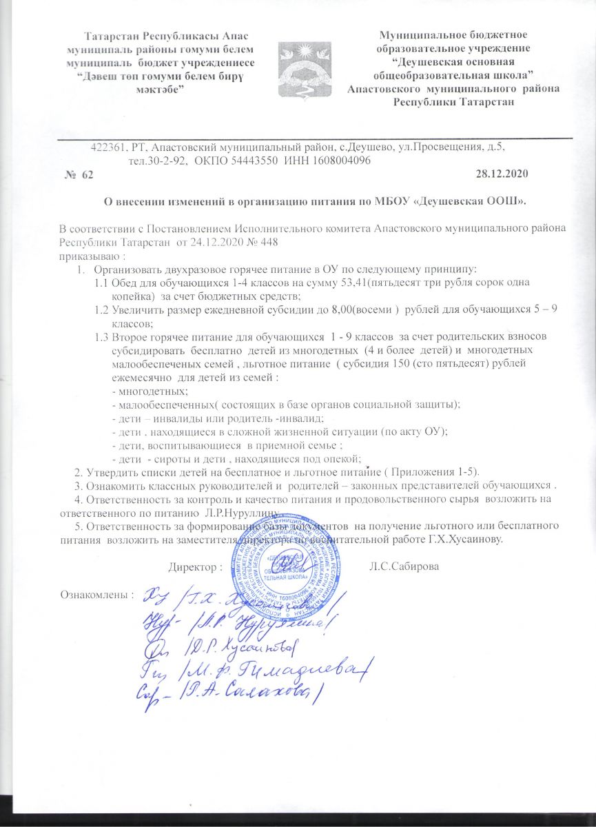 Приказ о внесении изменений в организацию питания от 28.12.2020